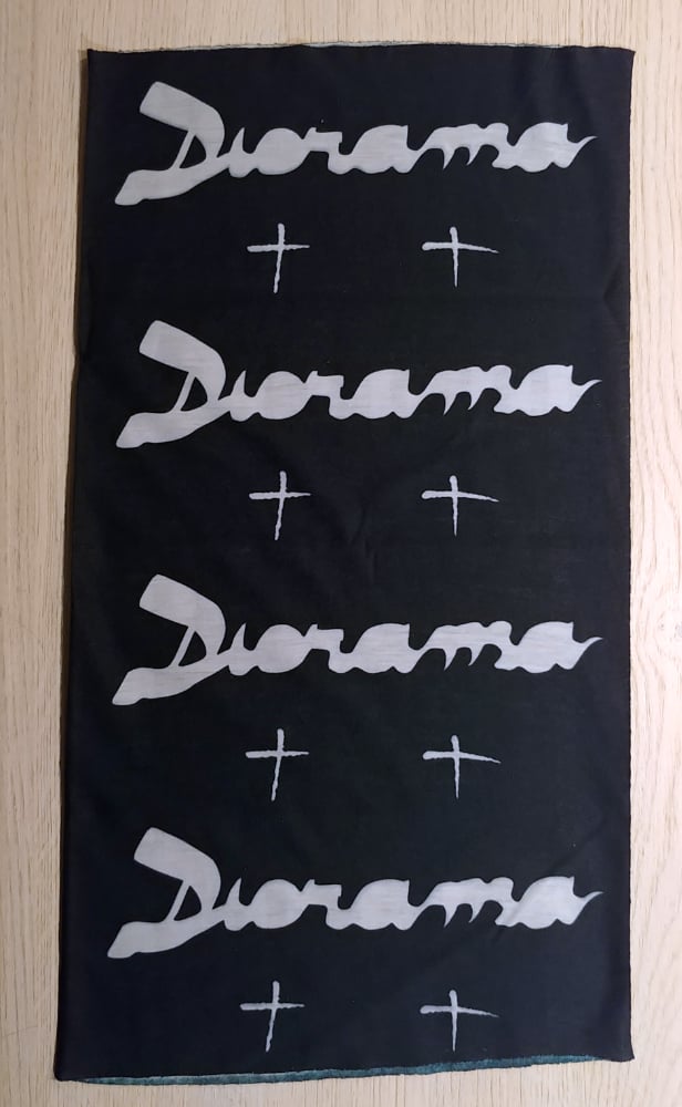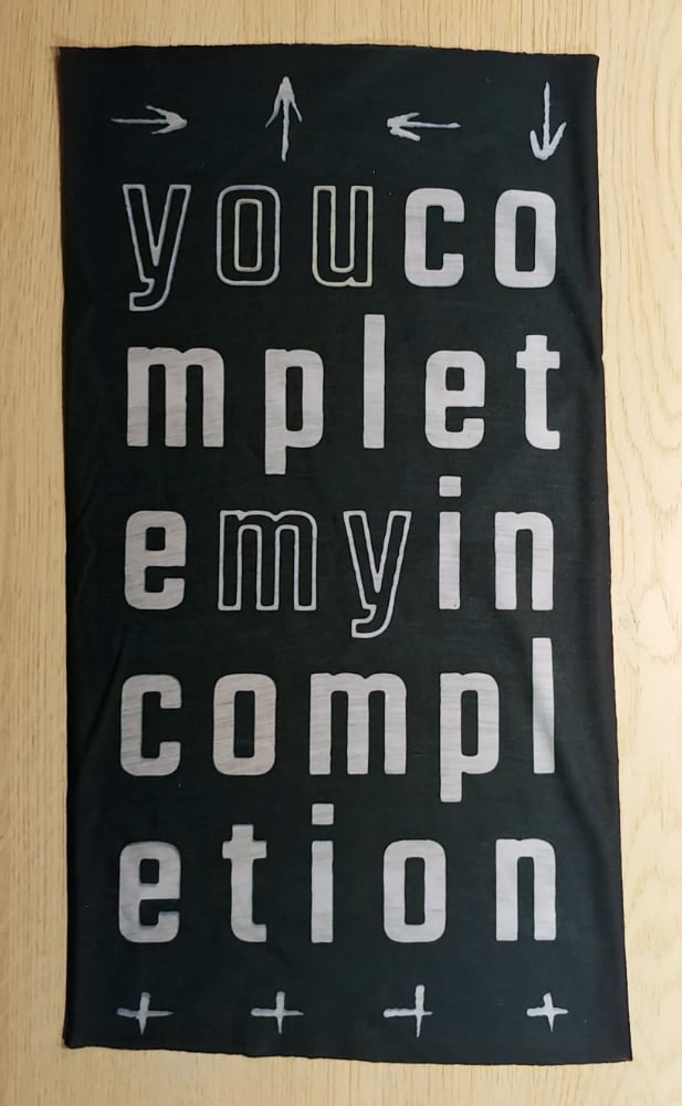 light casual black tube scarf with "you complete my incompletion" print in cool grey