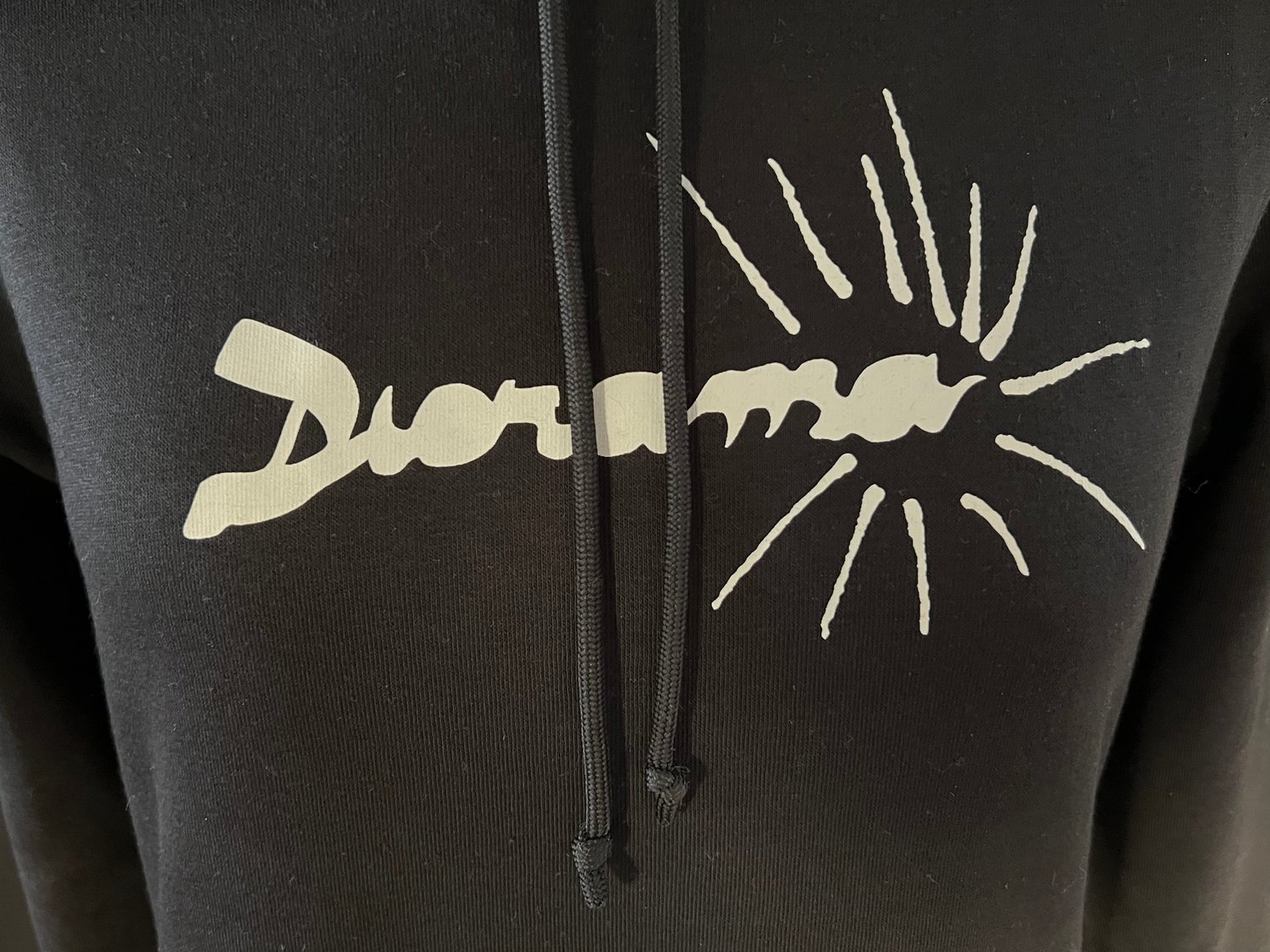 very good looking :-) women's bio hoodie sweater (hi i’m organic) with diorama logotype print on front and on hood.
